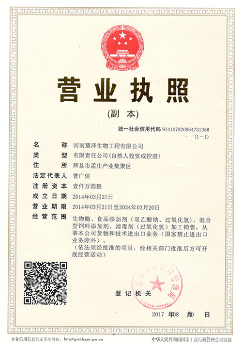鄭州慧澤生化科技有限公司是一家充滿朝氣的科研生產(chǎn)型高技術企業(yè)。目前公司業(yè)務主要集中在精細化工、食品化工和微生物制劑行業(yè)。公司現(xiàn)已建成鄭州、焦作、新鄉(xiāng)三個生產(chǎn)基地,其中河南新鄉(xiāng)輝縣孟莊生產(chǎn)基地占地70畝,總投資達1.2億。現(xiàn)擁有年產(chǎn)100000噸過氧化氫消毒劑,年產(chǎn)8000噸的過氧化鈣和年產(chǎn)5000噸的雙乙酸鈉的生產(chǎn)線,同時開設有生產(chǎn)總量5000噸的枯草芽孢桿菌、地衣芽孢桿菌等微生態(tài)制劑發(fā)酵生產(chǎn)車間。公司始終堅持“以人為本,科技興企,品質(zhì)優(yōu)良,用戶滿意”的經(jīng)營宗旨。為客戶創(chuàng)造價值更多的價值...